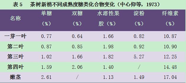 此外,茶梗作为鲜叶的营养传导器官,含有较高的糖分。茶鲜叶中含有很多糖类,除水溶果胶外,成熟叶、茎中几乎有的糖类均比幼嫩芽叶高(表5)。此外,高糖含量是黑茶鲜叶原料的重要生化特性,这是幼嫩芽叶所不能替代的。鲜叶原料这一生化特征,与黑茶品质的甜醇滋味的形成密不可分。