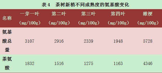 嫩梗中的氨基酸含量比芽叶多的多,特别是其中的茶氨酸,嫩梗的含量比芽叶高1-3倍。这主要是由于茶氨酸在根部合成,经木质部输送到地上部分之后,一部分产生谷氨酸参与茶树氮代谢,另一部分在新梢中积累,所以嫩梗中氨基酸(特别是茶氨酸)含量高。