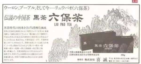 六堡茶在日本也曾作为保健药品,以“健美瘦身茶”、“油解茶”名称在各地药店出售。1991年,日本黑茶协会会长堤定藏先生专程到梧州茶叶进出口公司考察,后经日本药业界检测证实:六堡茶含有丰富的各种营养素,有强力的降脂解腻、减肥健美功效。这一消息传开后,六堡茶曾一度风靡日本东京。
