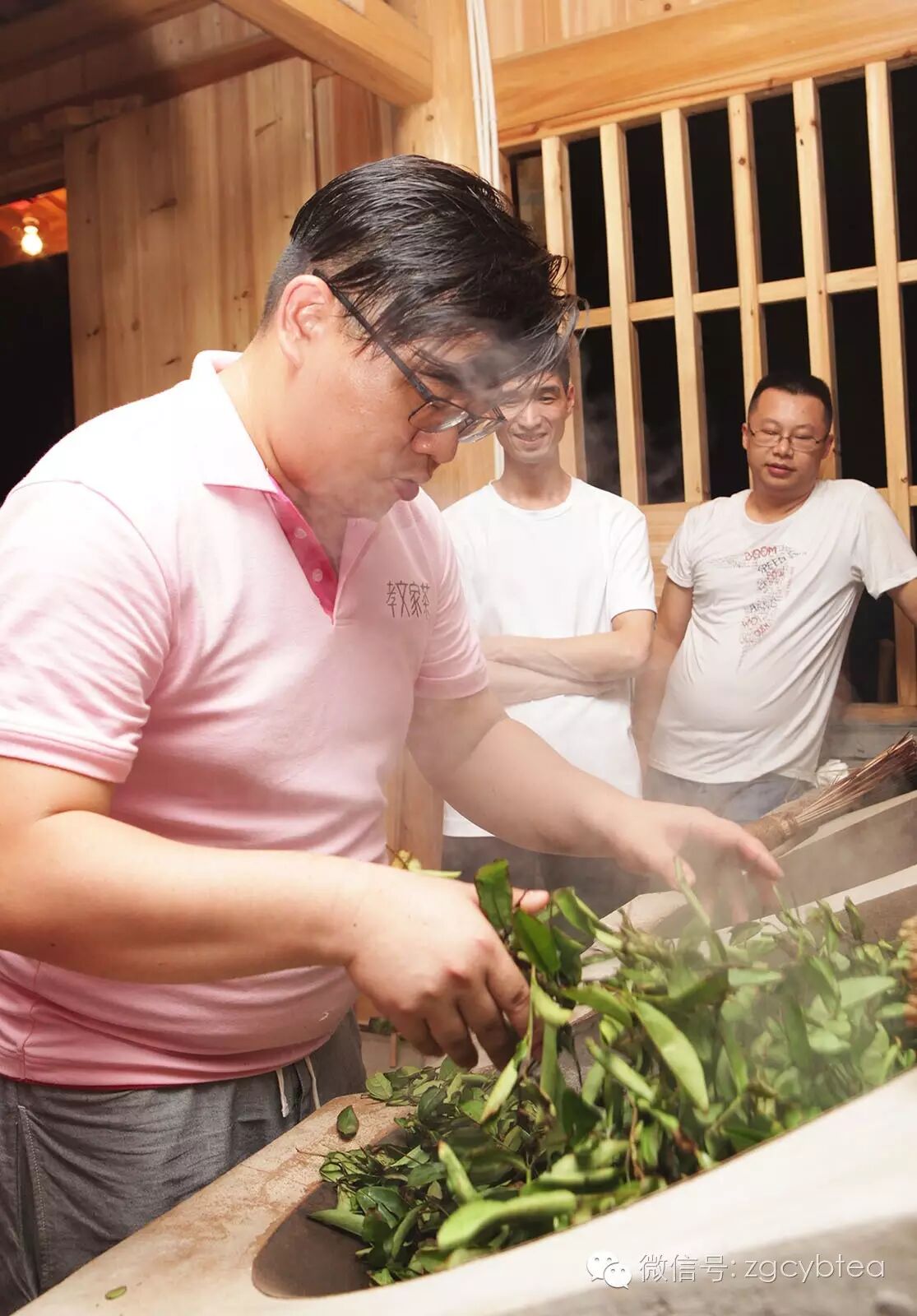 揉捻就是把展开的叶子搓成条状的过程,而且要求紧结成条。对力量要求非常高,也需要有节奏,松紧一致,往往需要用全身的体重来帮助揉捻。