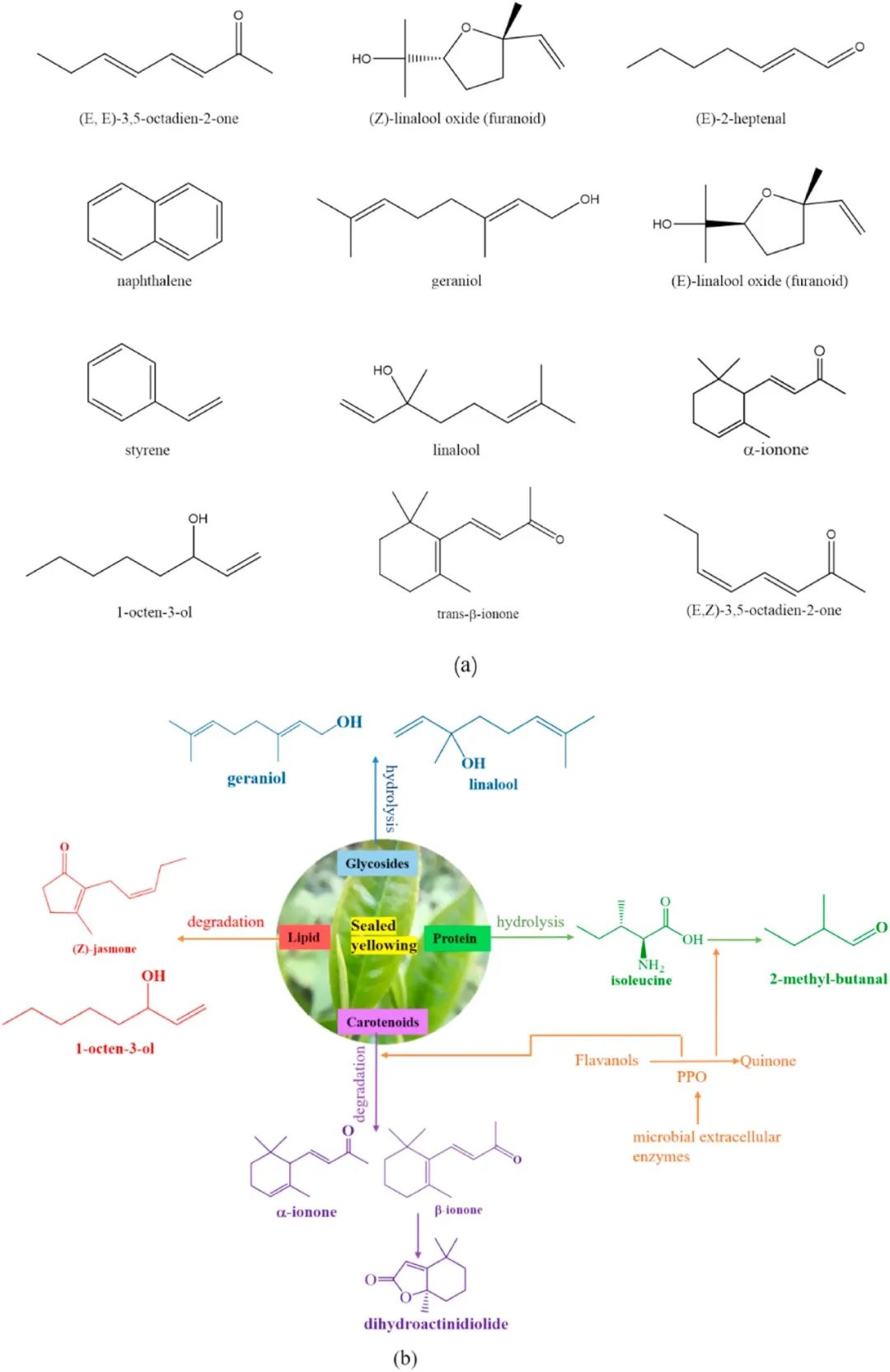 ▲图1 黄茶中发现的高香气强度(AIs)的关键香气物质。(a)重要关键香气化合物的化学结构。(b) 关键香气化合物的可能形成途径。