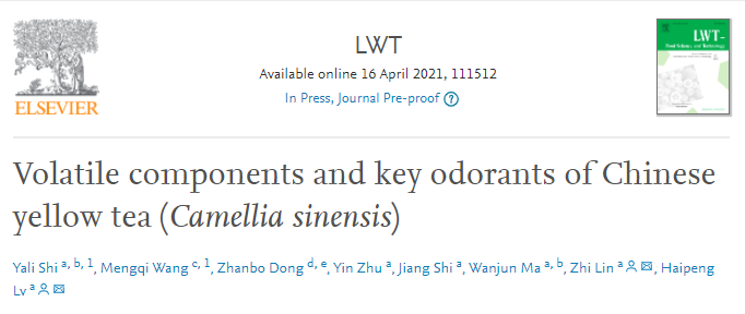 2021年4月16日,中国农业科学院茶叶研究所:Shi Yali(1作),……,林智*(通讯),吕海鹏*(通讯);日照市茶叶科学研究所:Wang Mengqi(共1)等在LWT-Food Science and Technology(IF:4.006)发表了题为“Volatile components and key odorants of Chinese yellow tea (Camellia sinensis)”的研究文章。该研究中,作者采用SBSE法结合GC-MS对黄茶香气化合物进行定性和定量分析。此外,作者还采用GC-O法对黄茶的关键香气物质进行了表征。该研究结果将丰富茶叶香气化学理论,为黄茶香气品质评价提供科学依据。