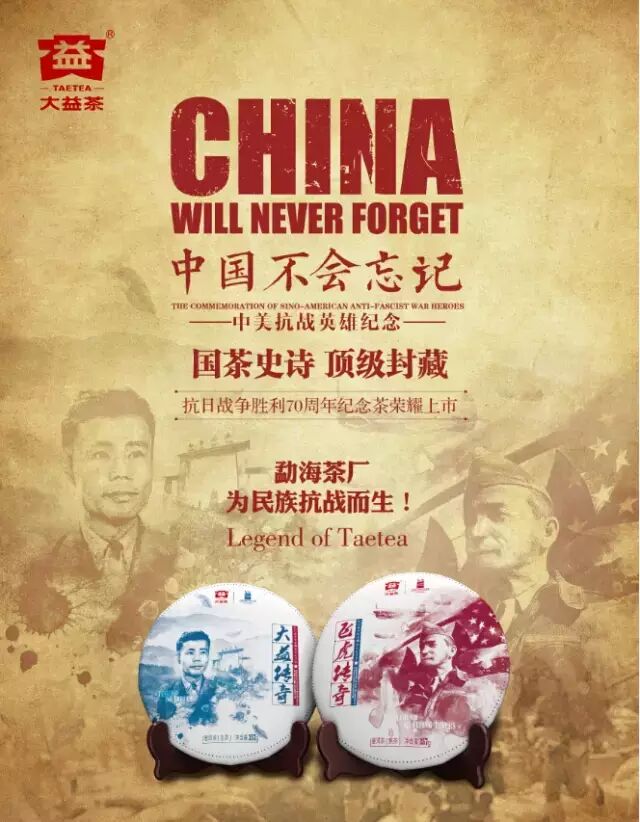 时隔70年之后,2015年,大益追随前辈茶人的热血激情,主办V70中美抗战英雄纪念系列活动,邀请美国抗战援华老兵回到云南与中国军民聚首,再度致敬历史,致敬和平!并为中美抗战英雄和所有关注抗战胜利七十周年的人们送上一份最为珍贵的礼物——中美抗战英雄纪念茶系列。