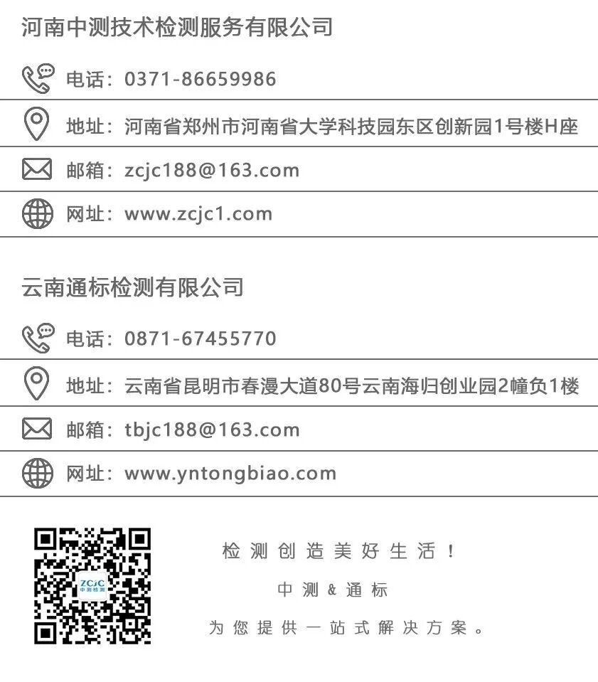 —END—河南中测技术检测服务有限公司是一家集检测、校准、检验、认证及技术服务为一体的综合性第三方机构,在全球范围内为企业专业提供一站式解决方案。多年来为政府部门和大型企事业集团客户提供检测、认证、监测等全方位检测认证服务。目前可承担环境检测、食品检测、公共卫生检测、作业场所检测、水质检测、空调通风系统卫生检测、防雷设施检测、化妆品检测、日化产品检测、饲料检测、药品残留检测、农兽药残留检测、放射性检测、化工原料及产品检测、基因检测、特种设备检测等理化、微生物参数的检验检测工作。