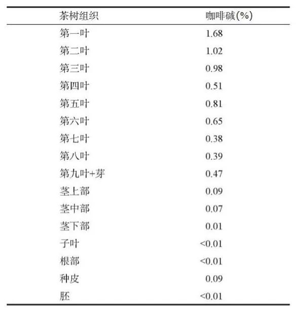 茶树中咖啡碱的分布与可可、咖啡等植物中的咖啡碱是主要存在于果实和种子中,叶片含量极少的分布情况不同,茶树几乎各个部位都含有咖啡碱,超过99%的咖啡碱存在于叶片中,除叶片外,茶花、茶树茎梗、茶籽和根部也含有微量的咖啡碱。咖啡碱在茶树新梢的幼嫩芽叶中含量最高,老叶中的含量要明显低于嫩芽。