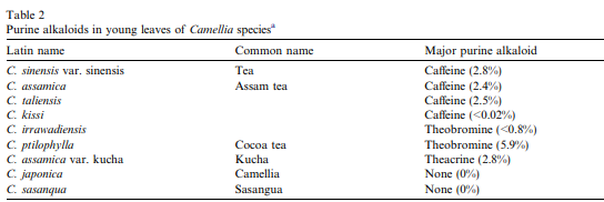 不同茶树主要的嘌呤生物碱(Ashihara H, Sano H, Crozier A. Caffeine and related purine alkaloids: Biosynthesis, catabolism, function and genetic engineering[J]. Phytochemistry, 2008, 69(4): 841-856.)