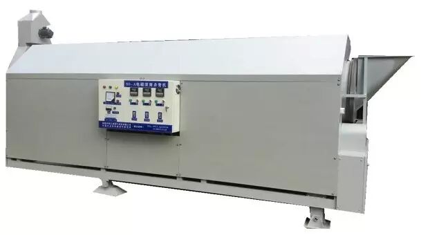 电磁加热是一种较新型的加热方式,它采用磁场感应涡流原理,高频电流通过环行线圈,产生无数封闭磁场力,当磁场的磁力线通过导磁物,即会产生无数的小涡流,从而使导磁物自行高速发热。据初步测算,与目前常用的电热圈、电热管发热相比,采用电磁加热节电可达30%以上。下图为宁波市姚江源机械有限公司生产的DC-80型电磁滚筒杀青机。