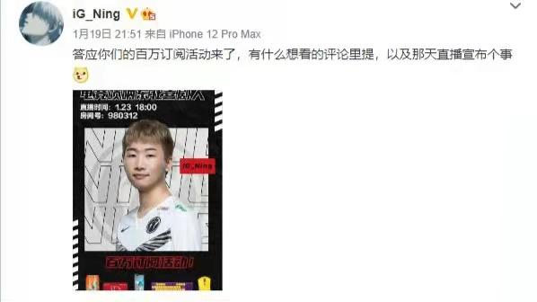 宁王的义举也吸引了越来越多的人关心此事,他们在浏览宁王微博时,却意外地注意到了宁王此前的一条微博动态,瞬间引发了整个LOL圈的关注。原来宁王在虎牙的直播间已经悄然达到了百万订阅,宁王为此征求大家的意见,想准备一些活动作为庆祝。而除了百万订阅达成外,最重磅的一个消息是,在即将到来的1月23日直播中,宁王还直言要宣布个重要的事,整一波大活。