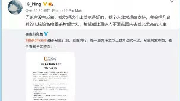 前言:2021年1月22日,B站UP主墨茶传来令人悲痛的消息,生前悲惨的生活境遇也遭到曝光,在网络上引起了轩然大波。随着此事件的持续发酵,很多网友都对墨茶表示同情,有的在他的主页下充电捐款,也有的自发成立了墨茶希望计划,希望这一计划能够拯救其他和墨茶境遇类似的人。而就在同日,IG宁王的动态引发LOL圈关注。