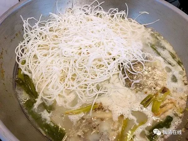 下水煮开,熬出鱼鲜后放入粉干,继续小火煨煮,至粉干膨胀,吸汁滿滿,加些芹菜就可开吃