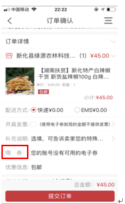 第九步:确定好商品数量、送货地址后提交订单(选择点击用券,选择电子券)支付即可。如果遇见未实名的情况复制链接:buy.cnn.com手机银行登录后继续支付即可