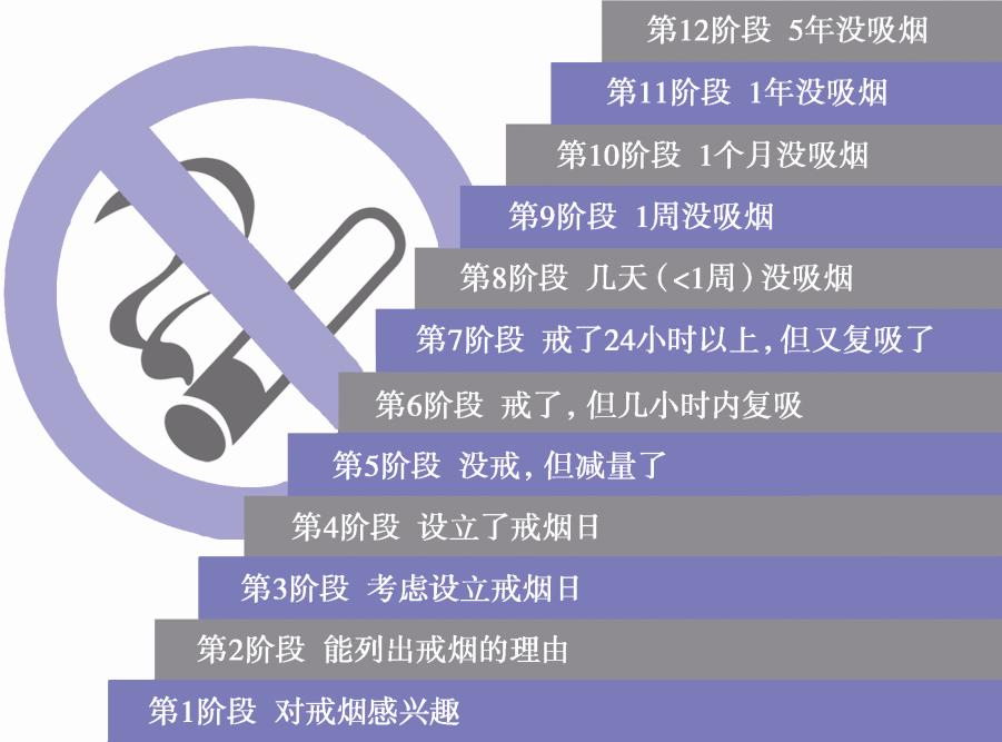 第二步,了解成功戒烟的过程。成功的戒烟,一般要经历从 “没有想过戒烟” 到 “完全戒烟” 的过程,这是一个递增的、阶段性的 “成功” 过程(图2),而不是只有 “戒” 或 “没戒” 两种状态。因此,戒烟往往不能一蹴而就,多数吸烟者会经历十二个阶段的全部或大部分阶段,最后才完全成功戒烟。如果您是一位烟民,又正在阅读这篇文章,说明您或多或少对戒烟有兴趣。那么,恭喜您!你已经迈出了成功戒烟的第一步。如果您现在抽出一分钟,列出两三条戒烟的理由,比如改善个人健康、节省经济花费、避免二手烟危害家人健康,那么您又迈出了成功戒烟的第二步!如果您曾经尝试过戒烟,只是后来又复吸了,那并不是什么失败,用不着灰心丧气,反而说明您已经位于成功阶梯的第6台阶之上,甚至还要更高,成功已经触手可及了。