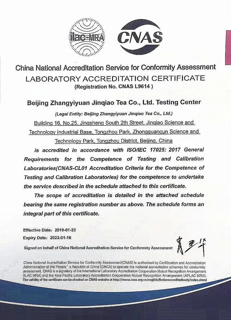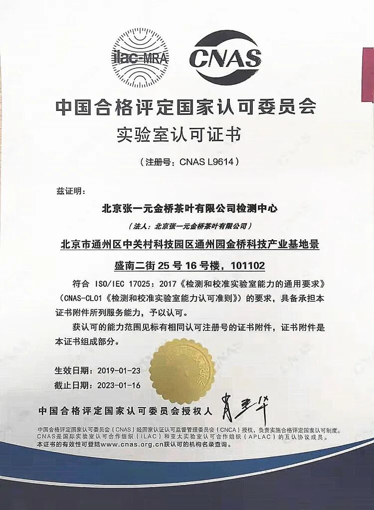 2017年1月17日,中国合格评定国家认可委员会(CNAS)批准了“北京张一元金桥茶叶有限公司检测中心”检测实验室CNAS认可申请。2019年1月,张一元检测中心顺利通过复评+扩项评审,成为符合国际标准ISO/IEC 17025:2017《检测和校准实验室能力的通用要求》的CNAS认可实验室,实验数据实现国际互认。自此,张一元检测中心可独立完成感官指标测定,理化指标检测,农药残留、微生物、重金属等指标检测的检测服务,检测的样品包括原料,过程产品,成品,以及生产环境监测,原料筛选样品等。每一批次的茶叶都要“身经百战”,检测合格后,最终通过张一元自有的物流公司配送到品牌连锁店和电商公司。
