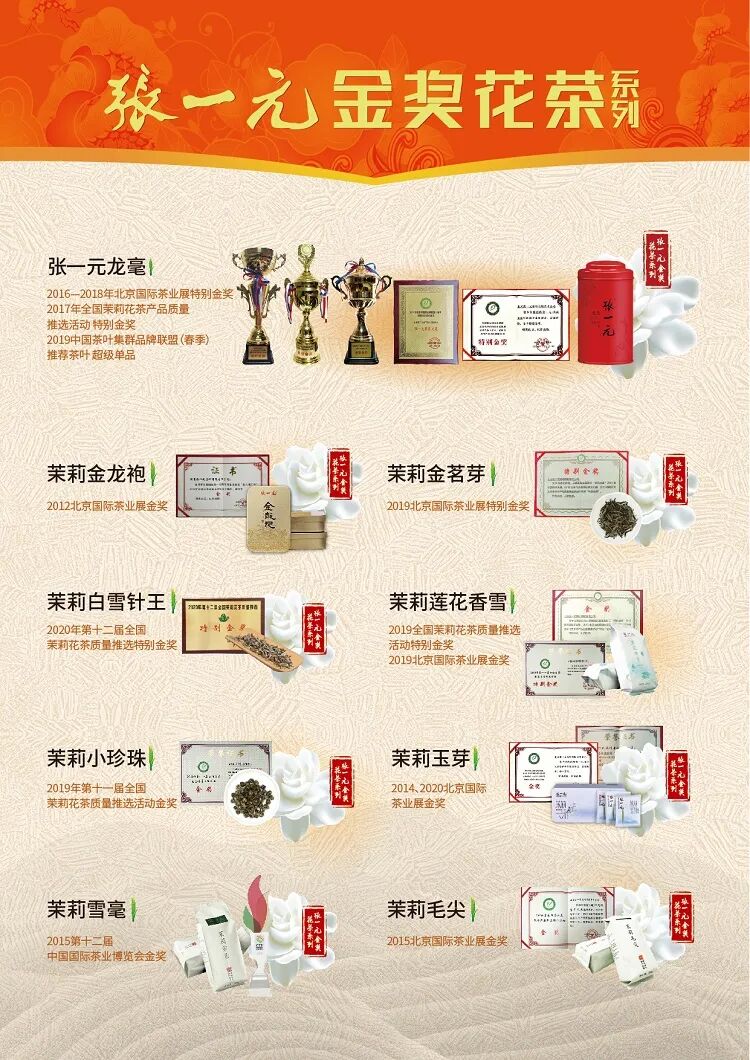 张一元茉莉花茶制作工艺、工序极其严格,一款茶从采摘、制茶坯、窨花等工序到上市历时多达半年之久。作为茉莉花茶第一个被列入国家级非遗的“绝技”,流传百年的张一元茉莉花茶制作技艺历经代代传承,焕发出愈加夺目的光彩。从2012年至今,张一元已有九款茉莉花茶获14项业内金奖,各具特色,形成了名副其实的“张一元金奖系列”。
