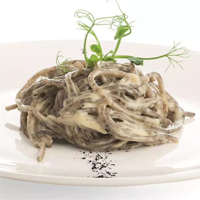 将一锅盐水烧开,放入意大利面,高火煮 2 分钟,控干水分,将帕马森乳酪奶油拌入意大利面装盘,撒入一小撮正山小种茶粉。