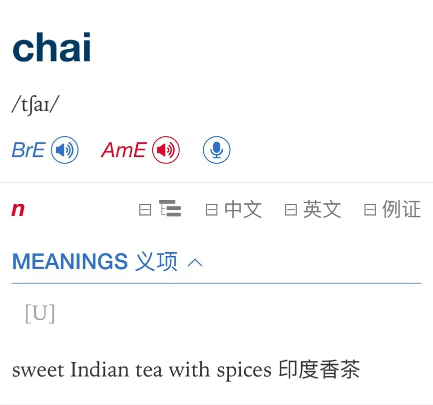 英语中其实吸收了“茶”的两种说法,一个是我们熟知的“tea”,另一个叫做“chai”。“chai”这个发音,据考究,是在十六世纪殖民史初期,由葡萄牙人带到全世界其他殖民地的。因为当时他们通常在中国都是与中原一带以及广东人做生意,于是就把广东人的“cha”根据自己的发音方式进行转换,这才有了“chai”。不过,也有一说,这个发音是源自古汉语/官话。看朗文的举例,比如印度香茶就叫做“sweet Indian tea with spices”。