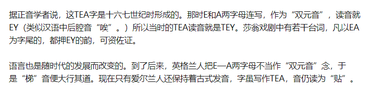 也就是说,本来英语也是读类似“tei”音的,但随着英格兰人在“EA”连读的读法上的转变,慢慢“EA”也就变成现在的 /iː/ 了。另外,在搜集资料的过程中我发现了一个很有意思的现象,“chai”和“tea”这两个词的分化,其实极大程度上取决于当时的茶叶是通过海路还是陆路传过去的,即海路一般传过去的是“tey”音,反之则是“chai”音。篇幅原因,这里就不细说了,不然就要一直追溯到马可波罗到底有没有来过中国了......