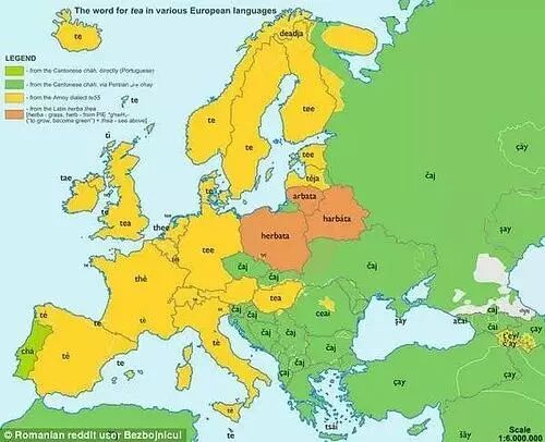 因为16世纪和17世纪初基本是荷兰独霸南亚、东南亚贸易,“Te”这个音就被西班牙、法国、德国、意大利、英国等国家沿用下来,并且带到了他们各自的殖民地。