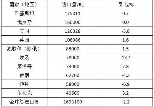 美国位居第三,进口12.6万吨,同比下降3.8%。其他主要进口市场分别为:英国10.9万吨、其他独联体国家8.8万吨、埃及7.8万吨、摩洛哥7.3万吨、伊朗6.3万吨、迪拜5.8万吨、伊拉克4.1万吨。