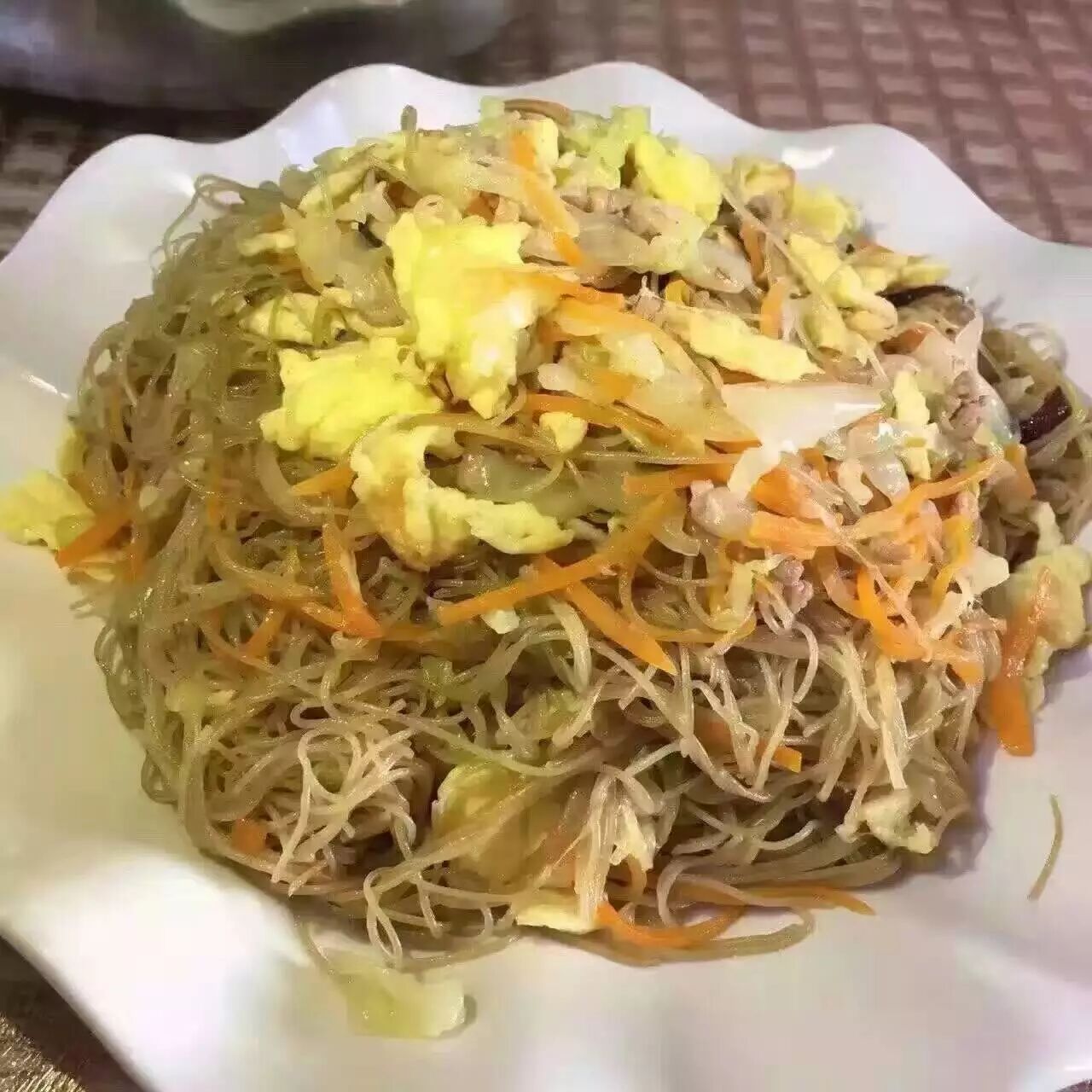 茶叶米粉适量、鸡蛋适量、瘦肉适量、火腿适量、胡萝卜适量、香葱适量、盐一小勺、酱油一小勺。