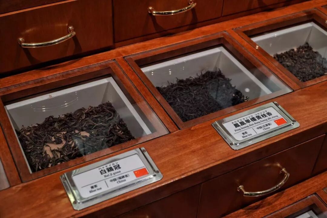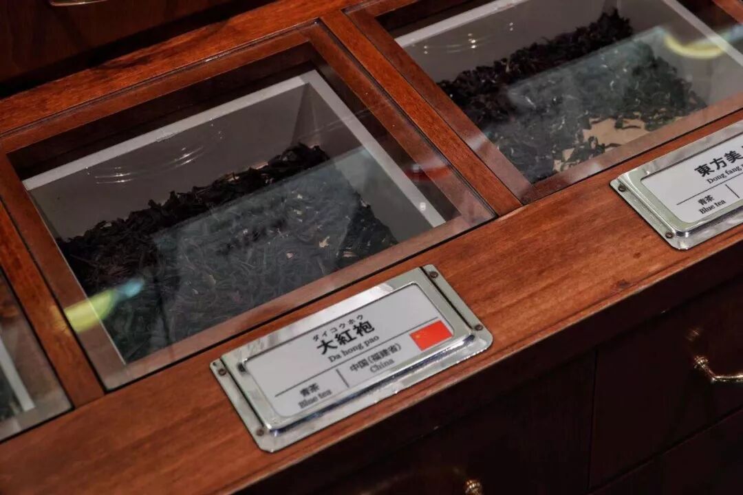 底下还直接有现成茶叶展示,看到了大红袍、东方美人、白鸡冠(岩茶)、凤凰单丛等等。