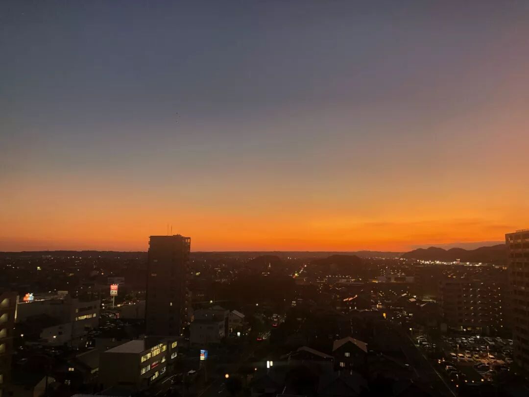 准备离开时,已接近傍晚,出了大门,保安大哥指着对面山方向,让我看看遥远处的富士山,很远,只可微微看到,所以没拍图片。回到酒店天开始黑了下来,在房间窗户见到了很美的夕阳,结束了一天行程。