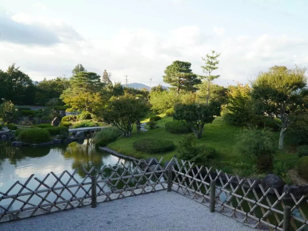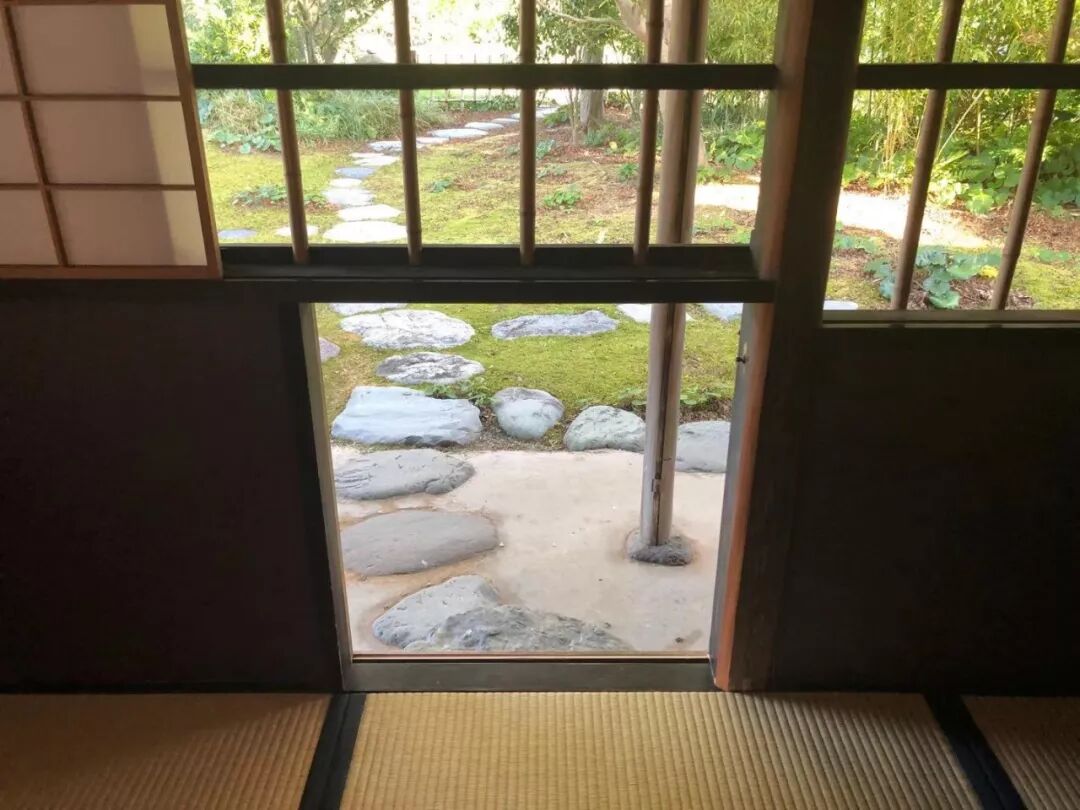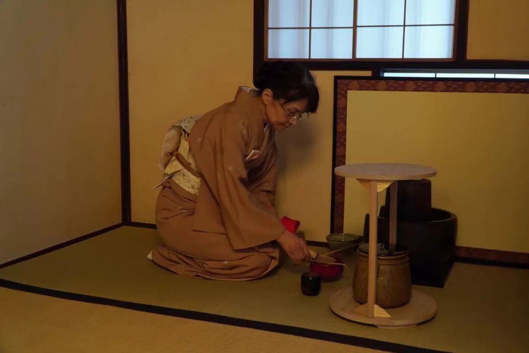 在参观之前,我们先去茶室体验了抹茶道,茶室就在小桥流水环抱的日式庭园中。在洁净的榻榻米上,身着庄严和服的茶师用志戸呂焼茶碗示范茶道,整个过程安静、认真。