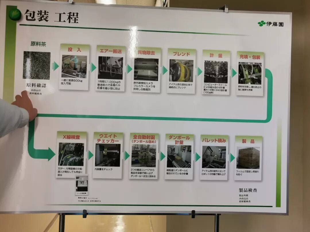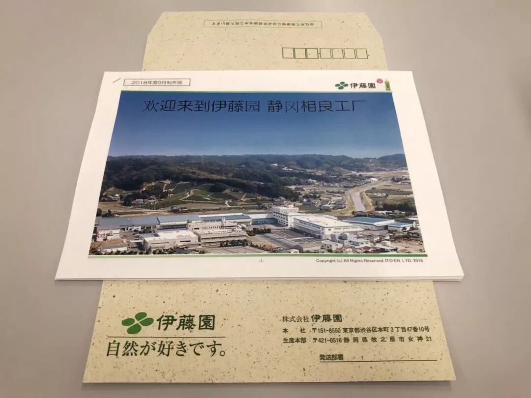 ( 这个信封纸是用茶叶渣做的,闻起来有淡淡的茶香,但不是伊藤园自己生产,他们提供技术与厂商合作进行废物再利用,茶渣原料提供不收费,免费给生产商使用。)伊藤园对产品开发有五个理念:自然、健康、安全、美味、优良的设计。他们本身不自己生产茶,原料都是靠通过收购而来,但他们有强大的产品研发和生产能力。负责人说,在日本,随着年轻人生活习惯改变,导致茶饮料消费上涨,原叶茶消费下降,因为方便,所以日本茶饮料市场能够快速被接受。我们在工厂参观了他们三条生产线,车间全程自动化操作,只需几个工人就能完成每天大量的产品包装,并且极其规范,每一个流程严谨而有序。