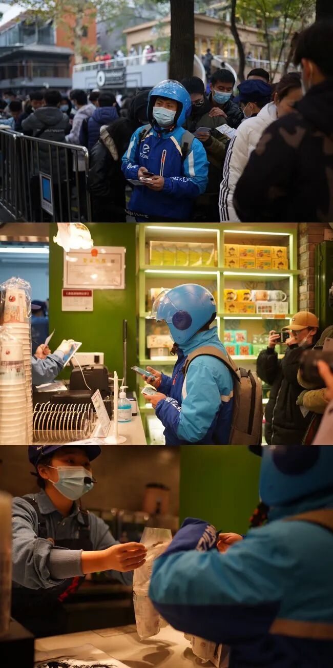 在排队的浩荡长龙中,还有多位饿了么、美团小哥的身影,他们是来代购的,每单的跑腿费在100元左右,有小哥早上代购了4杯赚了400元。