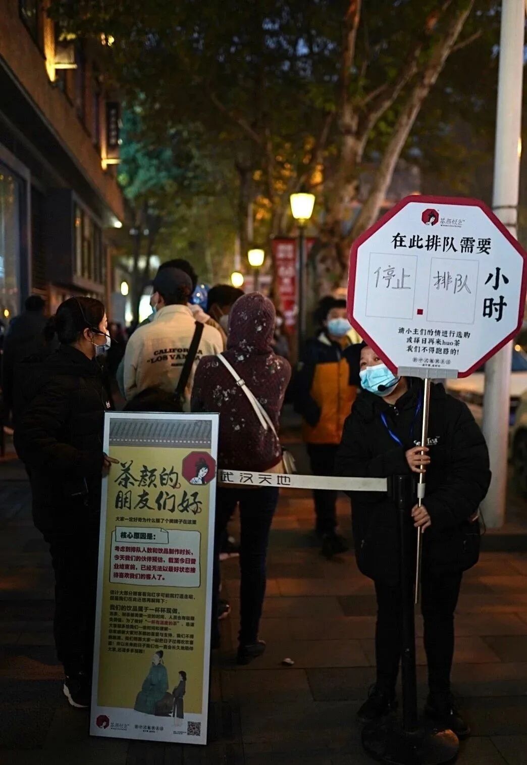 上午8点多,队伍也从茶颜悦色门口的围挡排到了武汉天地外马路边,顾客就被现场工作人员告知需要排队2-3小时。