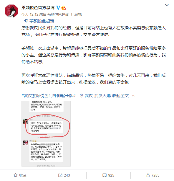 昨天,部分群里流传一张“奶茶店充场3小时40元工费”的群聊截图。茶颜悦色官方微博迅速辟谣,并表示已经报警处理。