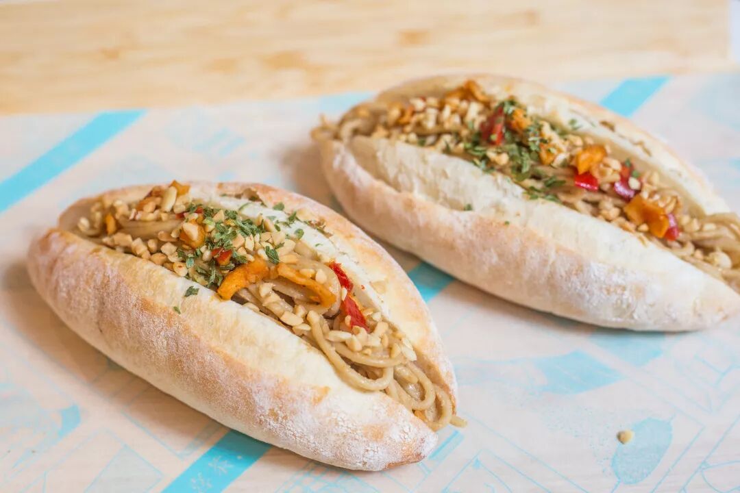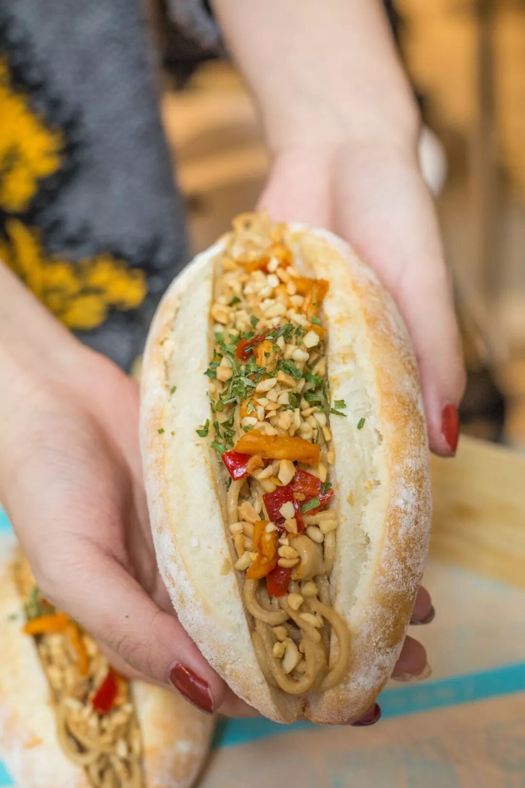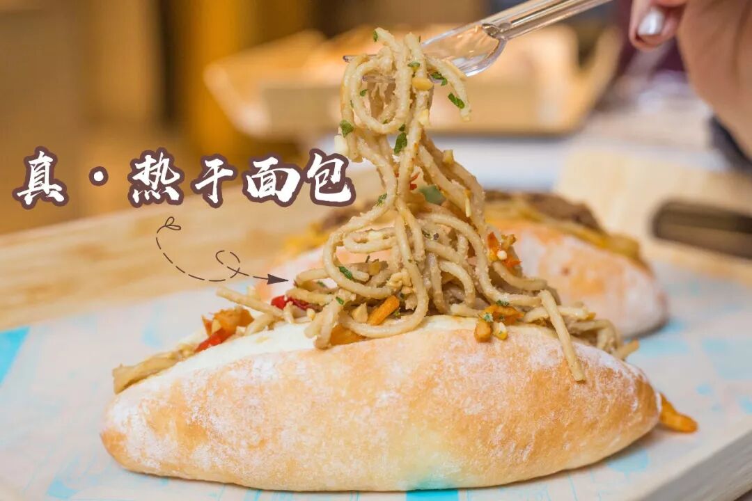 浓香热干面遇上手作欧包,撒上花生碎、萝卜干,以干葱末点缀,可以说是很酷了!颇有点咱们油饼包烧麦的混搭作风。