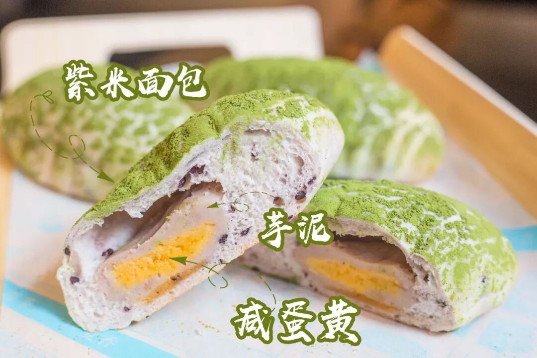 外表的紫米面包发酵得松软而有弹性,里面略带油的咸蛋黄和甜糯的芋泥,入口层次丰富。