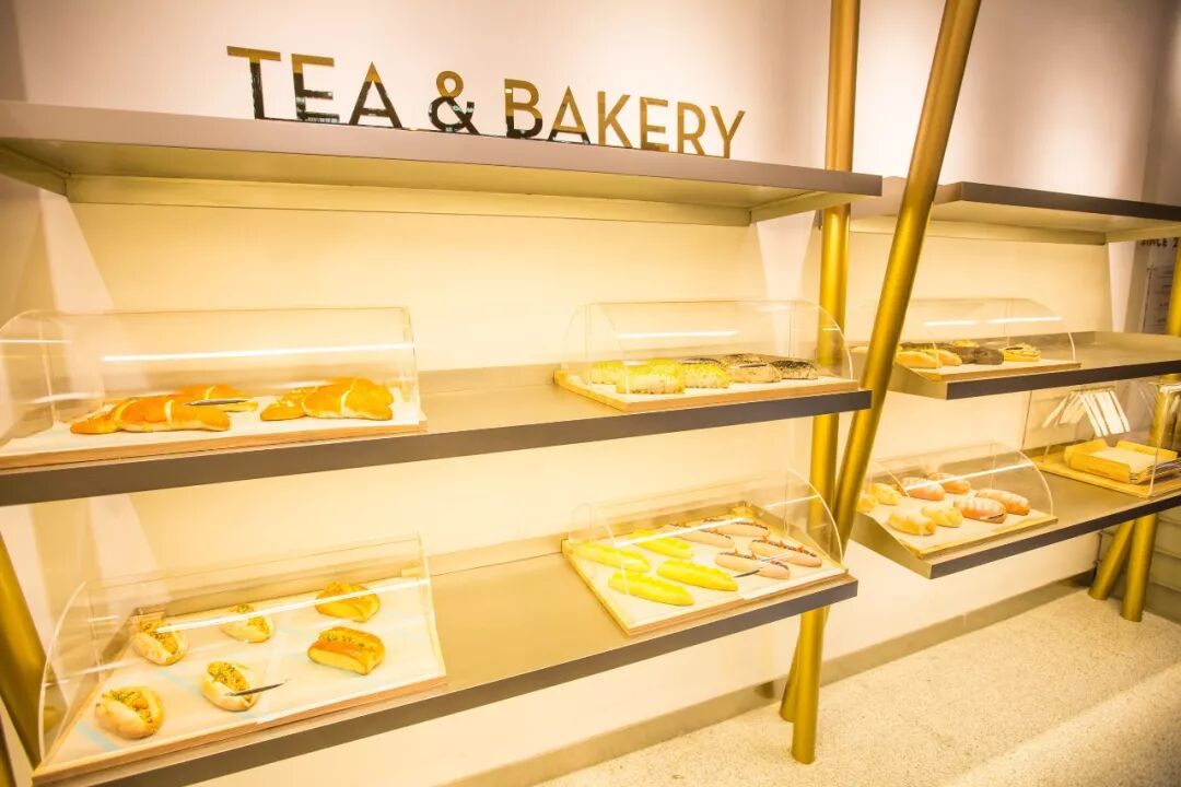 随意交错的香槟金柱支撑起临时感的面包架、也成为贯穿空间的线性雕塑。