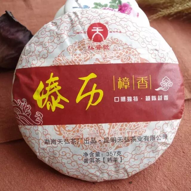 2015年天弘傣历樟香精选云南勐海茶区大叶种古树晒青毛茶为原料,传统工艺压制,樟香纯正浓郁。此茶是一款以突出熟茶樟香味的熟茶,经过公司精心选料以品质、口感、香气为最佳的优秀茶品。是一款回馈广大茶友的优质熟茶。汤色红浓透亮,樟香纯正持久,入口醇厚唇齿留香。叶底条索油黑发亮柔韧有弹性。