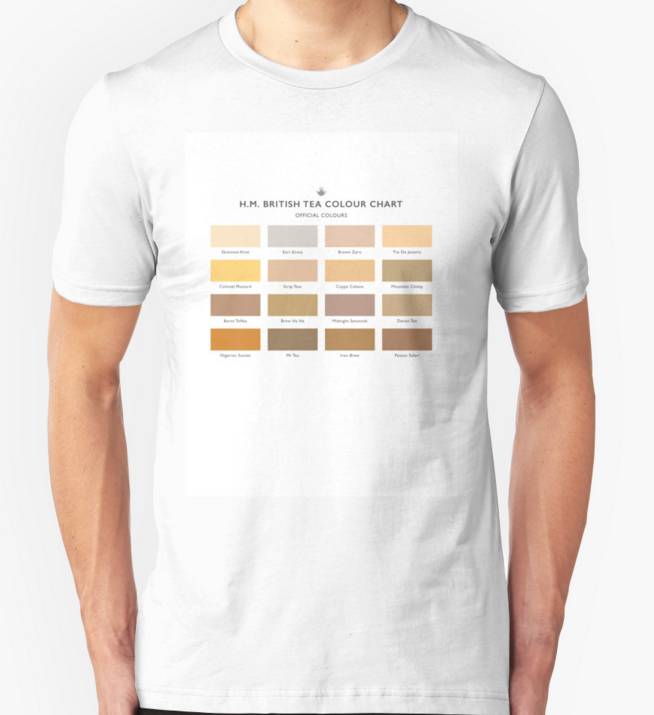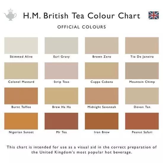 Black Tea(红茶)、White Tea(白茶)、Green Tea(绿茶)、Oolong Tea(乌龙茶)、Pu-erh Tea(普洱茶)、Rooibos Tea(南非红茶)、SingleEstate Teas(单一地产茶)、Flavoured Teas(加味茶)、Fruit & Herbal Tea(水果、草本茶)、 EarlGrey Tea(伯爵茶)、Darjeeling Tea(大吉岭茶)、Assam Tea(阿萨姆茶)、 CeylonTea(锡兰茶)、English Breakfast(早餐茶)、 Loose Tea(散装茶)、 InstantTea(速溶茶)、Canned Tea(瓶装茶)、decaffeinated(无咖啡因的,通常简写为decaf)它们各自冲泡出来的颜色根据品种和时间的长短都不一样,英国人还专门制作了T恤来普及知识。