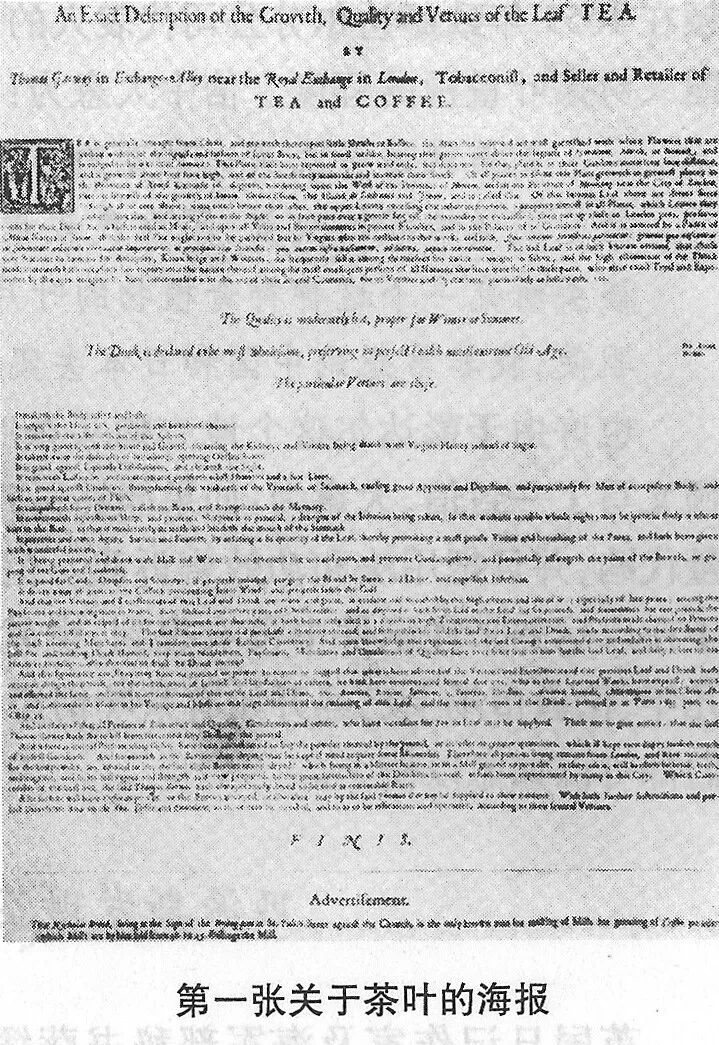 茶叶输人英国最早的时间没有明确记载,可能和17世纪中叶荷、德、法各国开始输人茶叶的时期差不多。我们从伦敦一间咖啡店的海报可以看到这一点。1657年以前,伦敦有一间咖啡店,名字叫做“托马斯·加威”,简称“加威”,曾经销售茶叶,但是仅供贵族宴会使用。因为当时英国茶叶完全依赖海外,在英国又是首次公开销售,因此每磅价格达到6-10英镑之高。