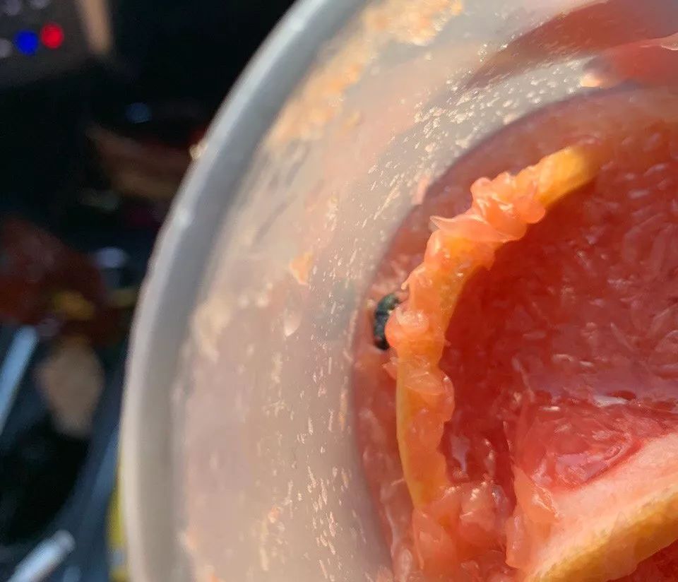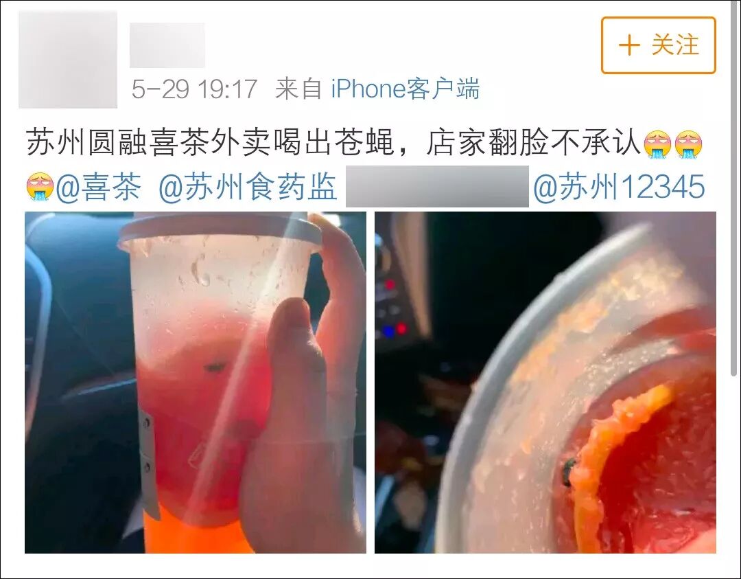 据姑苏晚报,前天下午2点王女士在外卖送来的喜茶中发现一个大苍蝇,这一名为“满杯红柚”的果茶,能明显看到有只绿色苍蝇。