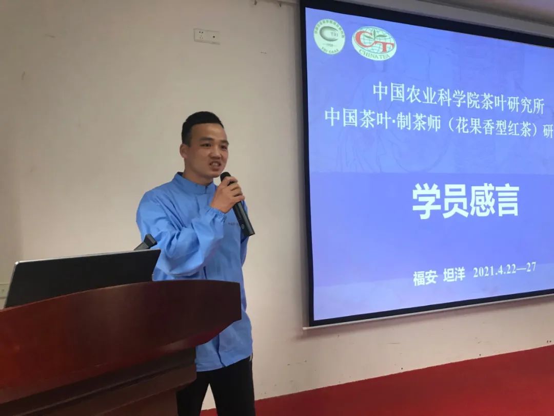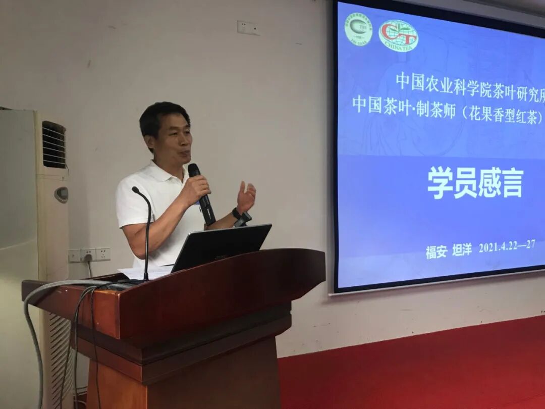 4月27日,中国农业科学院茶叶研究所中国茶叶 · 制茶师(花果香型红茶)研习班迎来结业仪式。结业仪式由中国农业科学院茶叶研究所茶业经济与信息研究中心主任翁蔚主持,我国知名茶学专家、茶树育种领域杰出代表、福建省茶科所郭吉春研究员,福建省茶叶质量检测中心站原站长、高级工程师陈金水老师,农业农村部茶叶指导组专家、福建省现代茶产业技术体系首席高峰老师,福建省种植业技术推广总站教授级高级农艺师、福建省茶行业职业教育指导委员会副主任苏峰老师,福安市茶产业发展中心温铃光主任,福安市农垦集团龚少平总经理,坦洋工夫非遗代表性传承人、福安市茶叶协会高级顾问林鸿老师,福建省种植业推广总站综合科副科长于学领老师,全国红茶加工大赛第二名得主、坦洋工夫十大制茶能手郑国华老师出席结业仪式。