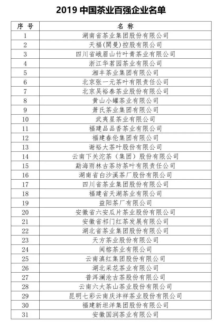 2019中国茶业百强企业名单