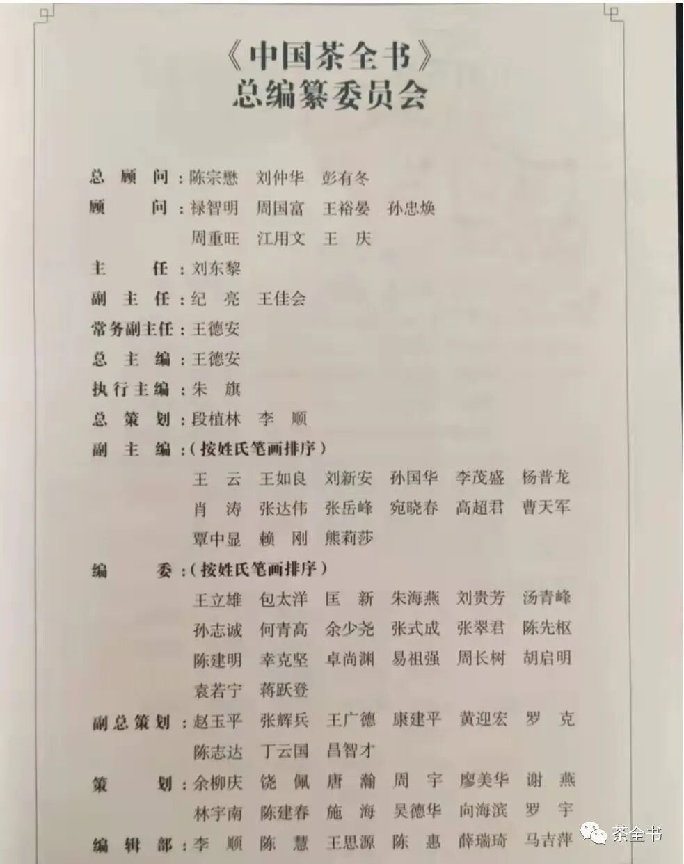 中国工程院院士陈宗懋、刘仲华院士、原国家林业和草原局副局长彭有冬任总顾问。贵州省人大常委会原副主任、贵州省茶叶协会会长禄智明、中国国际茶文化研究会会长周国富、山东省原副省长、山东省茶文化研究会会长王裕晏、中国国际茶文化研究会常务副会长孙忠焕、湖南省茶叶协会会长周重旺、中国茶叶学会理事长江用文、中国茶叶流通协会会长王庆任顾问。中国林业出版社社长刘东黎任主任,王德安任总主编,段植林、李顺任总策划。各省卷主编任《中国茶全书》总编纂委员会副主编。