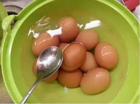 捞出鸡蛋,装盛有冷水的盆中,让鸡蛋冷却,边让鸡蛋冷却边用勺子敲打鸡蛋壳,均匀敲碎方便鸡蛋进盐入味