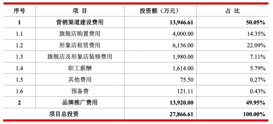全渠道营销网络建设项目总投资 2.79亿元,项目周期为42个月。其中,1.39亿元拟用于新增直营门店,包括0.4亿元的店铺购置费用;1.39亿元用于分年度进行品牌塑造推广。