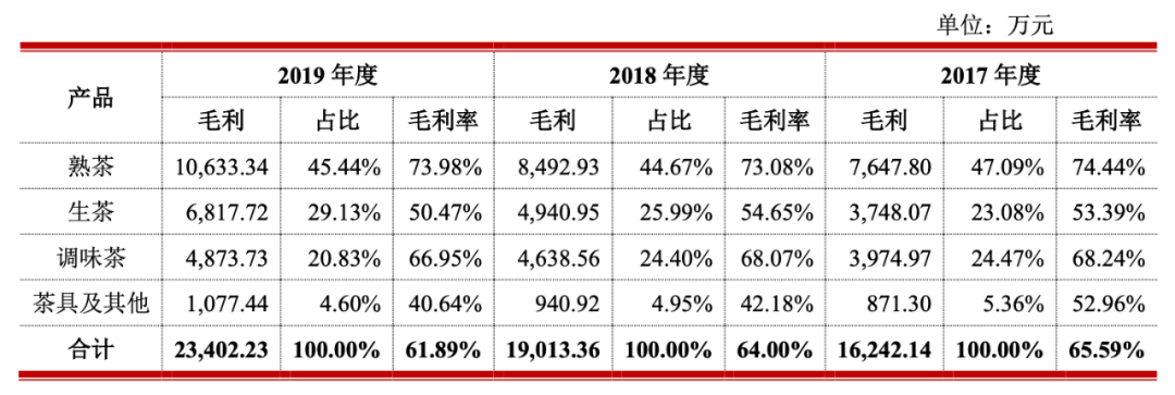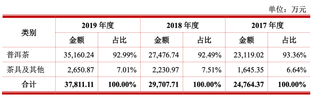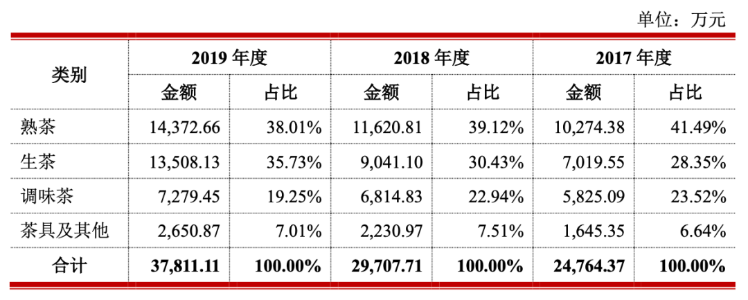 就销售金额而言,2019年度熟茶和生茶占比将近74%,其中熟茶占比为38.01%。