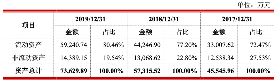 报告期内,随着行业发展和公司经营规模扩张,公司资产总额呈稳定增长趋 势。报告期各期末,公司流动资产占资产总额比例分别为 72.47%、77.20%、 80.46%,公司资产结构呈现以流动资产为主的特点。