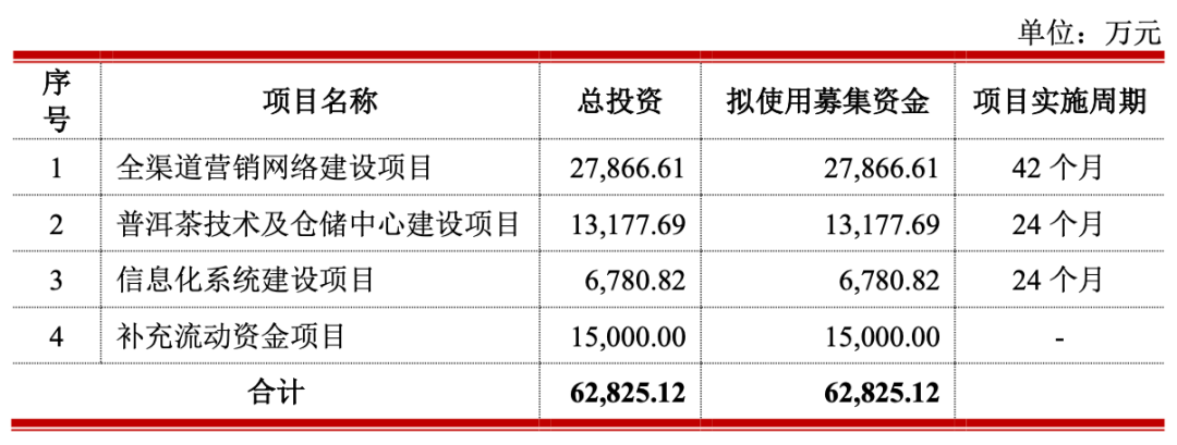 澜沧古茶拟募集资金6.30亿元,其中,用于全渠道营销网络建设2.79亿元、普洱茶技术及仓储中心建设1.32亿元、信息化系统建设0.68亿元、补充流动资金1.5亿元。