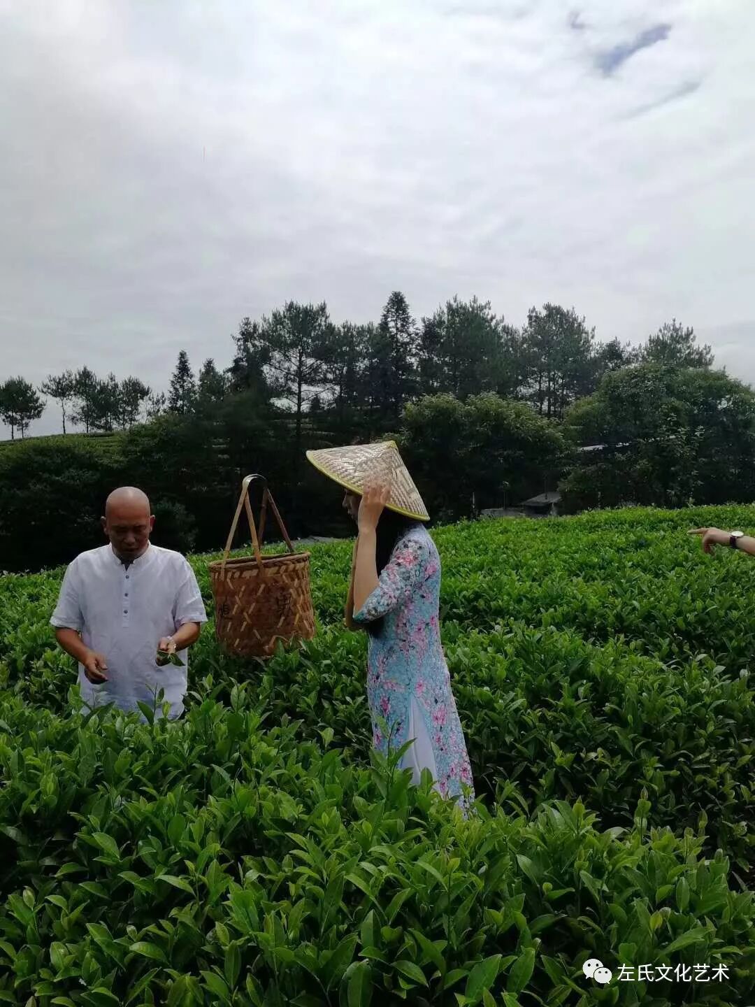 左金福董事长(左)与影视新星左镜伯(右)在茶园采茶