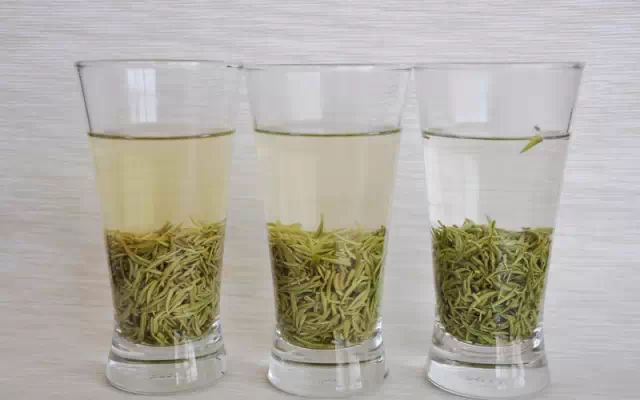 从左往右依次是下、中、上投法,你看出差别了吗?上投法的茶汤最清澈,其实《茶经》里也讲过信阳毛尖应用上投法最好,与碧螺春一样其茶芽细嫩,毫毛较多,用下投法茶汤滋味最浓郁。