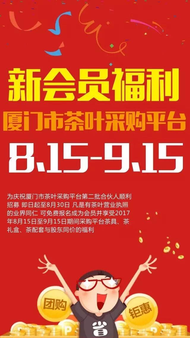 为庆祝厦门市茶叶采购平台第二批合伙人顺利招募 即日起至8月30日 凡是有茶叶营业执照的业界同仁 可免费报名成为会员并享受2017年8月15日至9月15日期间采购平台茶具、茶礼盒、茶配套与股东同价的福利 !