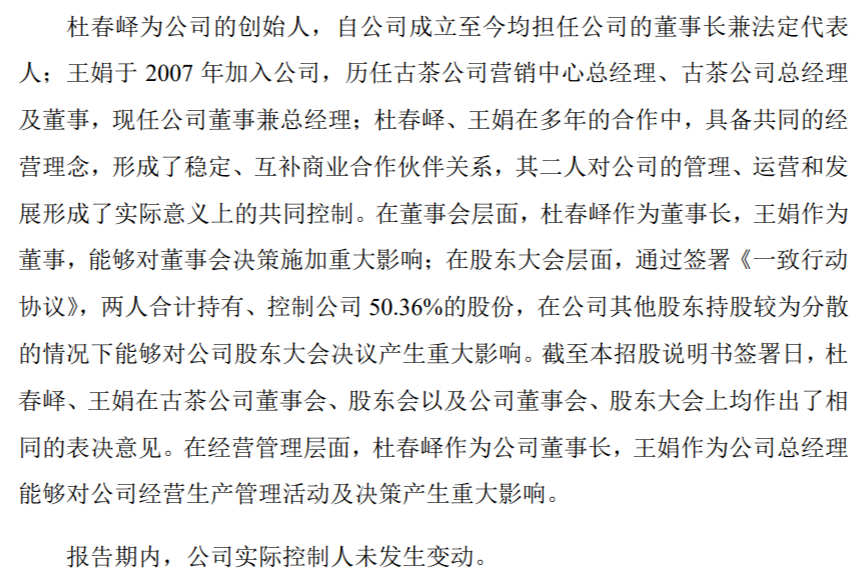 突发!上会前夕撤材料是不合规,还是涉财务造假关于突然撤回材料的原因,澜沧古茶相关负责人解释道:“受广州新冠病毒疫情影响,公司上会人员居住小区被封闭管理。经过审慎评估,公司于2021年5月31日向证监会提交撤回申请材料并暂缓本次上市进程。”但是网友似乎并不买账。申报前夕就备受关注,如今审核在即却选择撤回,难道是申报材料出了合规性问题,所以不敢了吗?一派认为,没什么实质性财务问题,只是申报材料中的《一致行动协议》出了问题:未针对实际控制人规定分歧、争议解决机制。根据招股书披露信息,杜春峄女士直接持有公司总股本的18.97%,杜春峄之配偶石跃持有公司总股本的 2.80%,杜春峄之女儿石艾灵持有公司总股本的 6.43%;王娟女士直接持有公司总股本的 13.88%,通过广州天速间接控制公司总股本的 8.28%;杜春峄、王娟共同持有、控制公司合计 50.36%的股份,系公司控股股东、实际控制人。杜春峄女士,1950 年 2 月出生,小学学历,现任公司董事长。王娟女士,1974 年 10 月出生,硕士研究生学历,现任公司董事、总经理。2018 年 2 月,杜春峄与王娟签署《一致行动协议》,该协议约定,杜春峄与王娟在处理有关公司经营发展且需经公司董事会、股东大会审议批准的重大事项时采取一致行动,有效期自协议签署日起至公司股票上市后三十六个月。